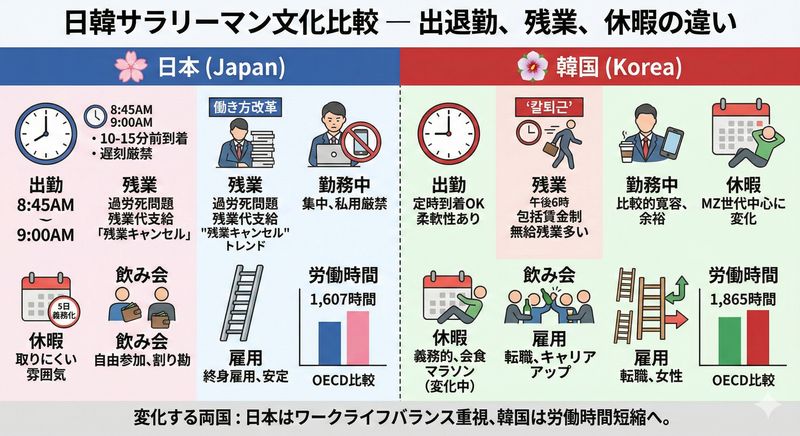 韓国と日本のサラリーマン文化比較 ― 出退勤、残業、休暇の違い